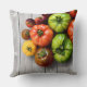 Ajoutez une touche de saveur à la chambre ou au salon avec cet élégant oreiller à jetons sur le thème de la nourriture, qui comprend un mélange de tomates rayées, vertes, violettes et jaunes sur une table de pique-nique grise patinée, cultivé maison (et oddball), est idéal pour améliorer la mémoire musculaire. Les cultivars de tomates photographiés comprennent Green Zebra, Red Zebra, Indigo Rose, Brandywine, Black Prince, Midnight Snack cherry, et la cerise d'héritier. Basé sur la photographie originale de W.H. Sim. Tous droits réservés. Voir plus sur zazzle.com/walkswithnature