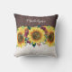 Ce coussin de tournesol personnalisé présente des tournesols couleur aquarelle et des roses bordeaux, des fleurs et des feuillages au style faux bois et dentelle. Personnalisez le texte avec un nom ou des initiales.