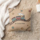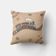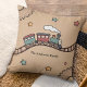 Un coussin avec une illustration d'un train en bois souriant tapoté le long d'une piste sinueuse. L'arrière - plan de la carte est un beige chaud, dégradé, avec des détails subtils comme des engrenages en bois et des étoiles dessinées à la main. Une bonne idée cadeau pour une famille ou un enfant !