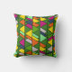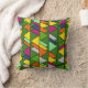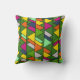 Cet oreiller de lancer a un design moderne du milieu du siècle de triangles superposés dans des couleurs fleuries courant verticalement sur un champ de vert.
