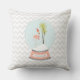 Un hiver/coussin de Noël comportant une illustration d'un flamant rose à l'intérieur d'un snowglobe. Le Flamant rose utilise une écharpe et un casquette rayés rouges tandis qu'été perché sur une neige a couvert l'île de deux palmiers. La base rose indique, "CHAUFFEZ LES SOUHAITS." L'arrière - plan est motif gris de chevron.