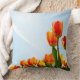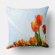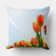 Coussin de carreau de photo avec des fleurs se composant des tulipes oranges et rouges vues d'un bas point de vue contre un ciel bleu.
