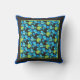 Un Oreiller à Throw ou un Coussin avec un motif abstrait "Blue Moons" en bleu vif et vert néon sur un arrière - plan noir; d'un collage de papier peint à la main par Judy Adamson.