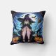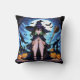 Une sorcière aux cheveux teintés de vert s'assied silencieusement en citrouilles brillants, entourés de chauves-souris, alors qu'une pleine lune jette une lumière enchanteresse sur un château lointain.