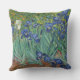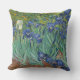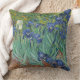 Ce beau coussin est inspiré par les Irises peints par Vincent van Gogh en 1889. L'image est ornée d'iris bleus aux tiges vertes et de feuilles aux pointes pointues plantées dans la terre brune-rouge.
