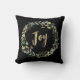 Ce magnifique coussin de vacances présente une couronne d'aquarelle festive de feuilles d'or, de verdure de Noël et de baies rouges sur un arrière - plan noir moderne. Le mot "joie" est présenté dans la calligraphie élégante, fausse or.