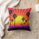 Add a pop of retro, tropical color to your home decor with this eye-catching throw pillow. Featuring a stylized graphic design of palm trees silhouetted against a vibrant sunset with radiating sunbursts in shades of yellow, orange, pink, and purple. Perfect accent for a modern, boho, or California-inspired living room or bedroom, shown here resting on a white couch with a cozy throw.