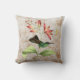 Le design de l'oreiller à jetons carré présente une illustration vintage du colibri à queue rousse (Thalurania furcata) Un colibri vert et bleu métallique repose sur un plante à bitume tropical aux fleurs roses de corail vibrantes, sur un arrière - plan à grunge vintage blanc cassé aux tourbillons dorés et aux silhouettes florales.
