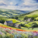 "Yorkshire Meadowsong". Paysage Yorkshire Dales. Cette aquarelle stylisée du Yorkshire Dales respire la tranquillité, avec des collines et des champs bordés de murs en pierre. Des maisons en pierre nichent le paysage, et des fleurs de prairie vibrantes offrent un contraste coloré, incarnant l'esprit paisible et détendu de la campagne.