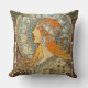 Un oreiller à lancer avec la lithographie, Zodiac (1896) par Alphonse Mucha, illustrateur et peintre d'origine tchèque. Portrait d'une femme avec des bijoux dans les cheveux assis devant un tableau de zodiac.