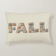Une coussin décorative cosy avec le mot "FALL" épelé dans des lettres patchwork fantaisistes et audacieuses. Chaque lettre est faite de différents motifs en tissu dans les tons chauds de l'automne comme l'orange, le marron, le turquoise et la crème, créant une ferme rustique et l'atmosphère saisonnière.