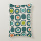 A retro-inspired grid of rounded squares arranged in six rows and six columns, each cell featuring concentric shapes in teal, orange, chartreuse green, turquoise and beige. The outer dark teal squares anchor the composition, while the varied inner shapes add rhythmic contrast and visual warmth. Set against a soft beige background, the pattern evokes mid-century modern design with its bold colors, geometric repetition, and nostalgic charm—perfect for textiles, wall art, or vintage-themed decor.