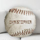 Une photo d'un baseball usé fournit l'arrière - plan pour cet oreiller à lancer rond personnalisé avec un nom personnalisable en police en détresse à l'ombre de brun rougeâtre qui correspond à la couture. Idéal pour les amateurs de baseball ou de sport sur votre liste de cadeaux.