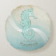 Cet oreiller rond jeté dans les couleurs douces de la mer et du sable vous permet d'ajouter facilement votre propre nom et texte en utilisant la modèle fournie. L'image simple de l'hippocampe sur un arrière - plan d'aquarelle en détresse est mise en évidence par un accent de vague en aqua et blanc. Recherchez ID623 pour voir la coordination des éléments balnéaires et des produits supplémentaires avec cette conception.