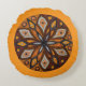 An intricately hand-drawn mandala in browns and grays on a round throw pillow.