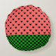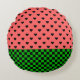 L'oreiller à jetons ronds Whimsical est doté d'un motif rose pastèque et de coeurs noirs avec bordure inférieure en damier vert foncé.