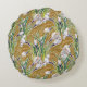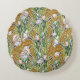 Coussin ronde avec un beau motif botanique floral, élaboré à partir d'esquisses de vie dessinées à la main. Fleurs printanières florissantes - crocus blancs avec des feuilles verts frais sur arrière - plan brun doré, points blancs éclaboussant autour d'eux. © Clipso-Callipso / Julia Khoroshikh