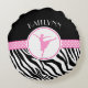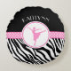 Coussin rond de zèbre d'impression de danse sauvage de ballerine dans le rose. Une silhouette de danseur classique pose à l'intérieur d'un cercle et il y a une bannière "à pois" pour le contraste. Ajoutez votre propre nom avant la commande ! En plus, employez la "personnaliser il" bouton pour plus d'options, y compris une police différente !