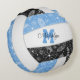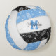 Ce coussin rond à thème girly volleyball présente l'image réaliste d'un volleyball bleu clair, noir et blanc qui a un motif de fleurs de doodle, plumes et paislies en blanc couvrant les panneaux bleu et noir du volleyball - personnalisez avec le nom de l'athlète et monogramme - par katz_d_zynes