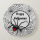 Accessoire votre maison Halloween avec ce coussin rond déplaisant. Ce coussin saisonnier présente un design noir et blanc avec araignée et revêtement de toile. Personnalisez ce coussin avec votre propre texte ou achetez comme indiqué avec "Happy Halloween"
