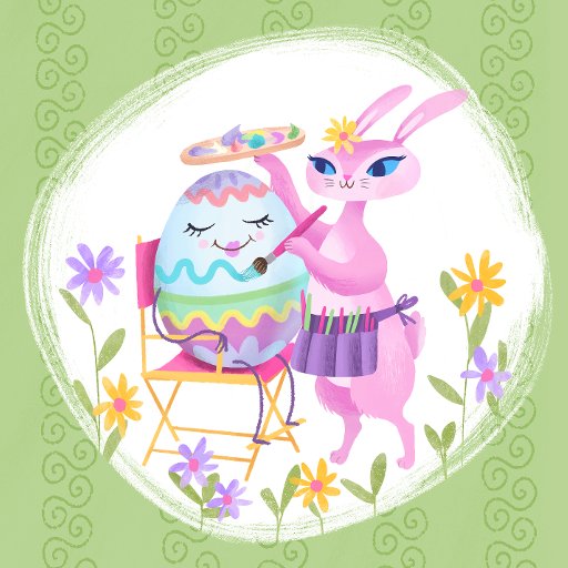 Un joyeux lapin rosé de Pâques décorent un oeuf de Pâques avec un assortiment de bleus, lavande et couleur vert citron pour bébé. Illustration originale de Noël Snow