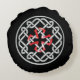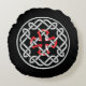 Un coussin rond avec un noeud celtique avec une croix carré rouge au centre.