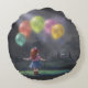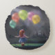 Une petite fille mignonne portant une chemise rose et une jupe bleue tient cinq ballons colorés. Elle apporte une tache de luminosité à un monde sombre. Au loin se trouve un bâtiment gris entouré de brume, d'arbres sombres et de montagnes.