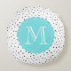 Coussin rond monogramme élégant et moderne avec motif pois noir avec tag bleu clair. Ce coussin minimaliste personnalisé sera parfait comme un cadeau.