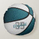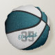 Ce coussin de basket-ball pour filles ou garçons présente l'image réaliste d'un basket-ball qui a alternativement des panneaux recolorés turquoises et blancs - personnalisez avec le nom du joueur dans une police de style "autographe" sur le numéro de maillot de l'athlète - par katz_d_zynes
