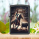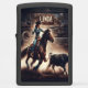 Een cowgirl rijdt een paard, lassoing een kalf in een stoffige rodeo arena. Op het bord boven staat Linda.