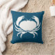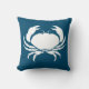 een deel van de oceaan, het decor CRAB WHITE op blauwe kussen aan één kant en witte strepen aan de achterkant. Ontwerp van Sandy Closs blue green blauwgroen aqua turquoise water shellfish krab kreeft zeekreeft