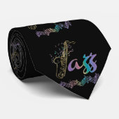 Cravate de jazz - cravate noire de notes de saxophone et de musique. Le jazz a orthographié avec les notes musicales d'un saxophone et d'arc-en-ciel en pastel coloré. Un grand cadeau pour votre joueur de saxo, musicien ou mélomane préféré.