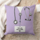 Uniek verpleegkundig kussenontwerp met ziekenhuisscrubs, een stethoscoop en een Zwitsers legermes. Bewerk tekst om een naam en professionele referenties toe te voegen.