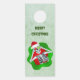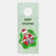 Deze papieren deurhanger is lichtgroen met een griezelig Merry Christmas-skelet dat ornamenten tegen zijn gezicht houdt voor ogen met een kerstmuts in een groene en rode spattervorm. Pas jouw tekst aan de voor- en achterkant aan met de sjabloon.