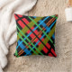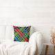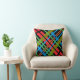 Deze vrolijke gooiende kussen tonen een kleurrijk abstract patroon van kromme lijnen in rood, oranje, groen, geel, blauw en zwart op een zwarte achtergrond. Het afbeelding wordt op de achterkant herhaald.