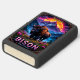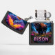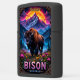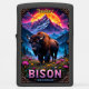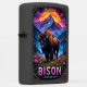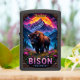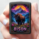 This stunning personalized graphic, ideal for a custom lighter, showcases a grand Buffalo (or Bison) in a vibrant meadow of pink and purple wildflowers. The scene is dominated by a majestic mountain range under an enormous, glowing orange moon and a dramatically colorful sky of deep purples and pinks. The frame is an ornate Baroque style. The customizable name (Theodore placeholder) and the bold pink text "BISON" and "BUFFALO" make this a unique Western and wildlife-themed gift, capturing a powerful outdoor moment with a touch of modern flair.