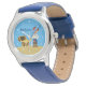 Cool piraat kinder horloge met een boekanier met een zwaard naast een schatkist gevuld met goud op een strand met blauwe hemelachtergrond. Pas het polshorloge van deze coole jongen aan met de naam van je kind in het wit. Ahoy Matey.