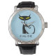 Dit gepersonaliseerde polshorloge ontwerp is voorzien van een retro mid-eeuwse moderne "atomaire" zwarte kat met grote gele ogen en een krullende staart. U kunt de spelling van de tekst eenvoudig wijzigen; lettertypestijl, -kleur en -grootte met de Zazzle Personalize-knop.
