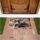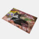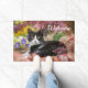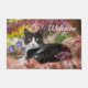 Cute cat, tuxedo-patroon zwart-wit bicolor, European Shorthair, rust onder een Japanse apel in een bloeiende tuin en zag er vreemd uit. Foto genomen door Katho Menden. Deze deurmat is een cadeauidee voor kattenliefhebbers.