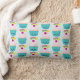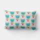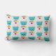 Een gevlekte kussen met een lichtblauwe en witte gestreepte achtergrond. Lagen over de bovenkant is een schattige blauwe cupcake met roze vorst en een kawaii glimlachend gezicht. Een kersen bovenaan heeft ook een schattig gezicht. Een vallende ster vliegt in de lucht.