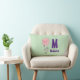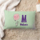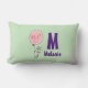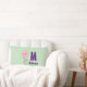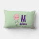 Een lumbale kussen die hallo op de voorkant en afscheid op de achterkant met een onnozele bunny die een grote roze ballon in de lucht zweeft. Reeks op een lichtgroene achtergrond. Personaliseer met jouw naam en monogram initiaal.