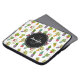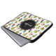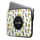 Gepersonaliseerde laptophoes met een leuk en leuk patroon. Illustraties van verschillende cactus, zittend in bloempotten met cartoony vrolijke glimlachende gezichten. Een zwarte cirkel die over de bovenkant met jouw naam en initiaal binnenin gelaagd wordt.