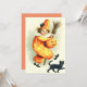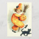 Geef een traktatie naast je truc deze Halloween. Deze afdruk toont een schattige kleine clown met een glimlachende hefboom op de lantaarn, een bezem in de hand en een zwarte kat op de voeten.