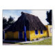 Cozumelarchitectuur die lijkt op volkskunst met levendig geel en blauw in een van de meest afgelegen gebieden op het schiereiland Yucatan in Mexico. Sommige families hebben zich veel moeite getroost om dit dak zo charmant mogelijk te maken. De deur en het venster lijsten, evenals één post op de uiterst linkerkant van de voormuur, zijn bedekt met folkkunst design in levendige, primaire kleuren.
