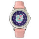 Een horloge met een schattige illustratie met een caketaart en een ijsje die glimlacht met vreugde. Een regenboog en harten omringen de tekening. Een schattige fluffy wolk glimlacht ook met geluk. De cupcake en de ijsjes hebben een trendy eenhoorn bovenaan. Stijlvol en schattig design vol van vreugde.