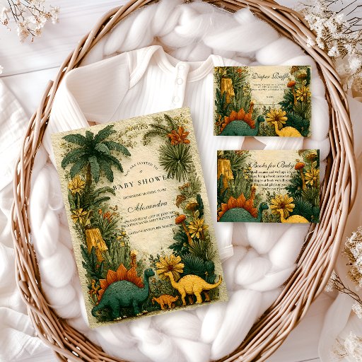 Step into a lush prehistoric paradise with this vintage-style dinosaur design. Featuring palm trees, ferns, and gentle dinosaurs in warm earthy tones, it’s perfect for a baby shower with adventure and charm. A timeless blend of tropical greenery and whimsical Jurassic nostalgia.