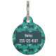 Een label van de douanehond met de naam van uw huisdier en op de rug zijn naam en uw telefoonaantal. Ontworpen met een repetitief patroon met een schattige glimlach met floppyoren en een hondenbot. Groene achtergrond.