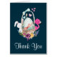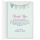 Een baby shower bedankt je kaart met een leuke waterverf illustratie van een ei in een mandje. Ook gedecorbeerd met linten, bogen, bloemen en weinig hart. Een roze flamingo en een wit konijnenkonijn zitten aan beide zijden geduldig te wachten op de grote dag. De binnenkant van de kaart heeft een bundelbanner en een gepersonaliseerd bericht.