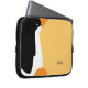 Deze zachte afdekking voor uw laptop in neopreen is voorzien van een schattige keizerpinguïn in zwart wit en oranje aan de voorkant van het sleeve (de achterkant is zwart).