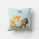 Een kussen met een schattige illustratie met een baby hert en een kleine eekhoorn met een eikel en een vlinder boven hun hoofd. Deze schattige bosarealen staan op een gras met een aantal zwevende paddenstoelen bij hun voeten. Lichtblauwe achtergrond.